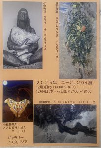 お知らせ お知らせ 2025.12.02 2025年ユーシュンカイ展 2025年ユーシュンカイ展 12月3日(水)〜7日(日) 12澤〜18時 (初日のみ14時〜18時) 小野啓亘 WATANABE TOSHIMI 小豆島美知 國清俊男